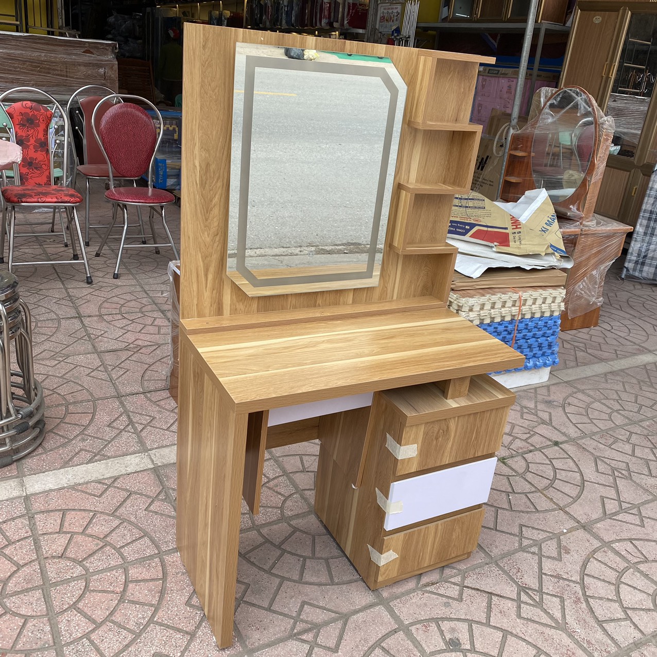 Bàn trang điểm được thiết kế gồm 4 ngăn kéo+khuy vàng bắt mắt