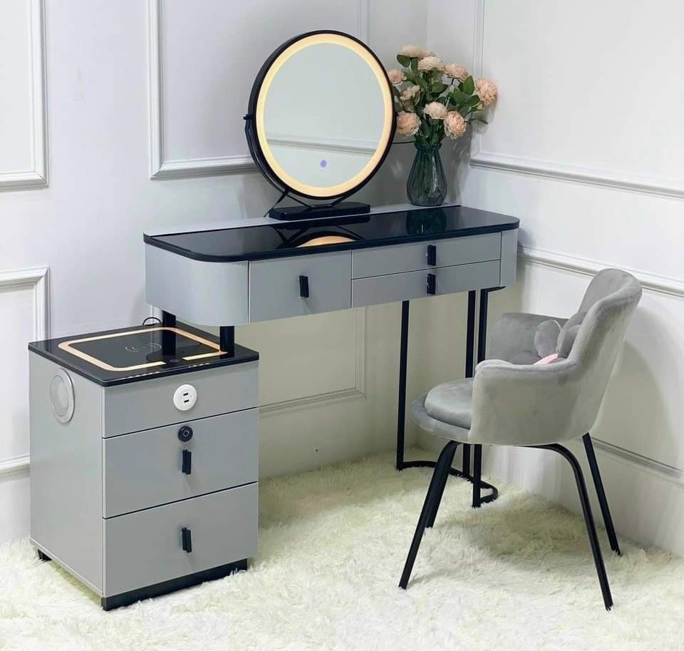 Kiểu dáng: Mẫu bàn trang điểm có kiểu dáng gọn gàng, với đường nét thẳng, phong cách hiện đại đầy cá tính. Bàn gồm khóa vân tay, sạc không dây, sạc có dây.